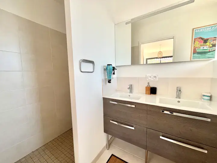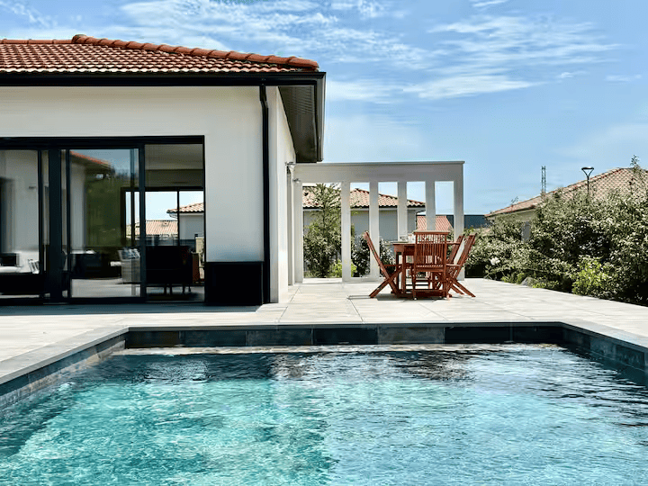 Villa neuve à Gujan-Mestras, situé dans un quartier calme et résidentiel, proche d’Arcachon et de la dune du Pilat. 4 chambres dont une suite parentale. Une grande terrasse avec piscine chauffée, espace repas, transats et chiliennes. Barbecue, boulodrome, tout est réuni pour des moments conviviaux.